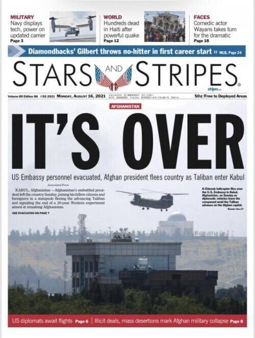 该推文配图显现,在《星条旗报》当日头版,大写加粗的“全完毕了”(Its over)有目共睹。该报导以为,这既是阿富汗政府的“完毕”,也是西方20年来改造阿富汗试验的“完毕”。